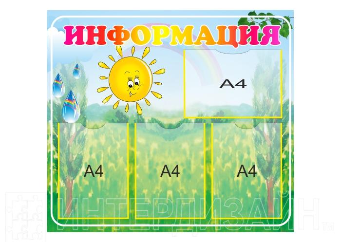 Стенд изготовлен из пластика ПВХ толщиной 3 мм. Изображение наносится на пленку. Дополнительно стенд оборудован 4 карманами А4 формата, в которые можно разместить всю необходимую информацию.