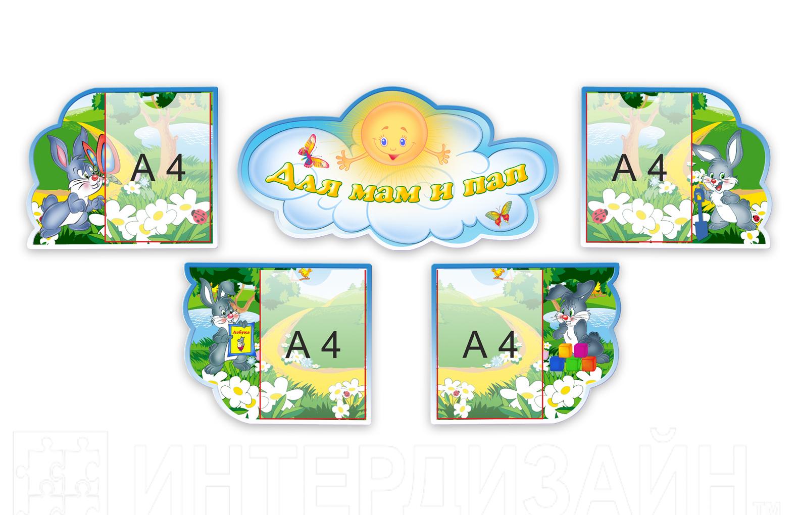 Размерстенд-шапка - 585мм*300мм; 4 стенда-кармана - 385мм*330мм
