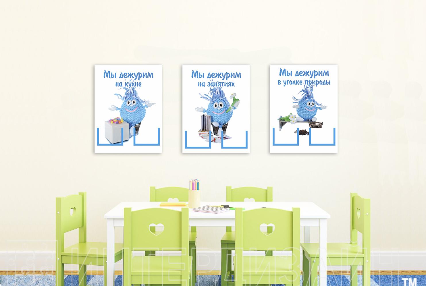 Стенд имеет три рубрики (Мы дежурим на кухне; Мы дежурим в уголке природы; Мы дежурим на занятиях ), в каждой из которых оборудовано по два кармана для удобного размещения имен дежурных. Стенд выполнен из прочного ПВХ 3 мм и защищен от выгорания под действием прямых солнечных лучей.