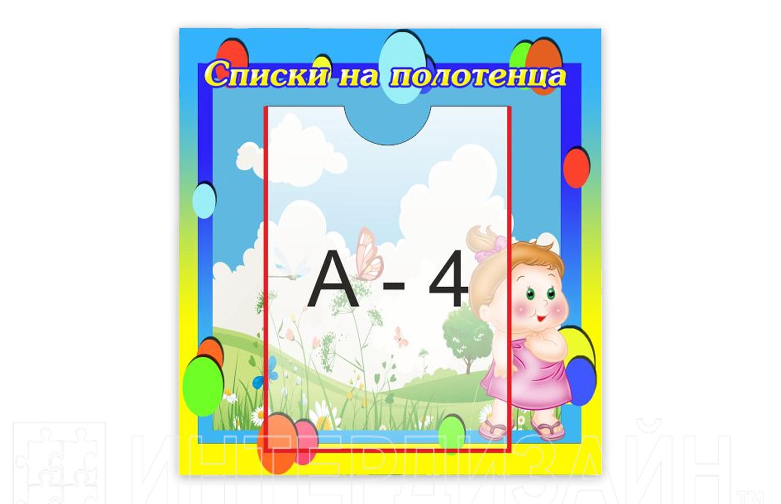 Стенд "Список на полотенца" из набора "Кнопочки" для оформления группы в едином стиле. Материал основы стенда - пластик. Изображение - высококачественная печать с защитой от ультрафиолета. На стенде имеется карман А4.