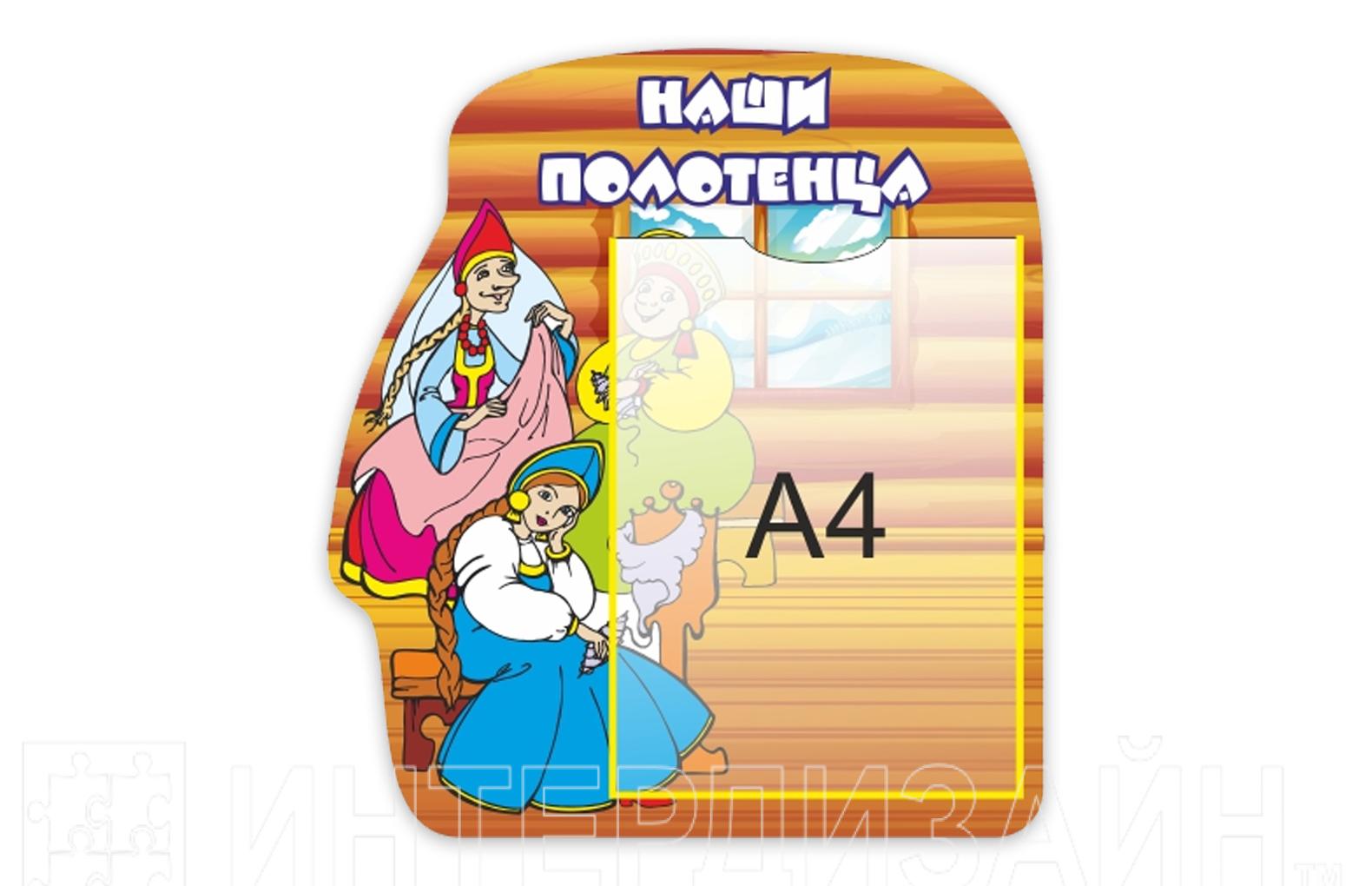 Стенд "Наши полотенца" изготовлен из пластика, обрудован карманом А4. Изображение – УФ-печать , (гарантированно не выгорает, не выцветает на протяжении 5 лет)