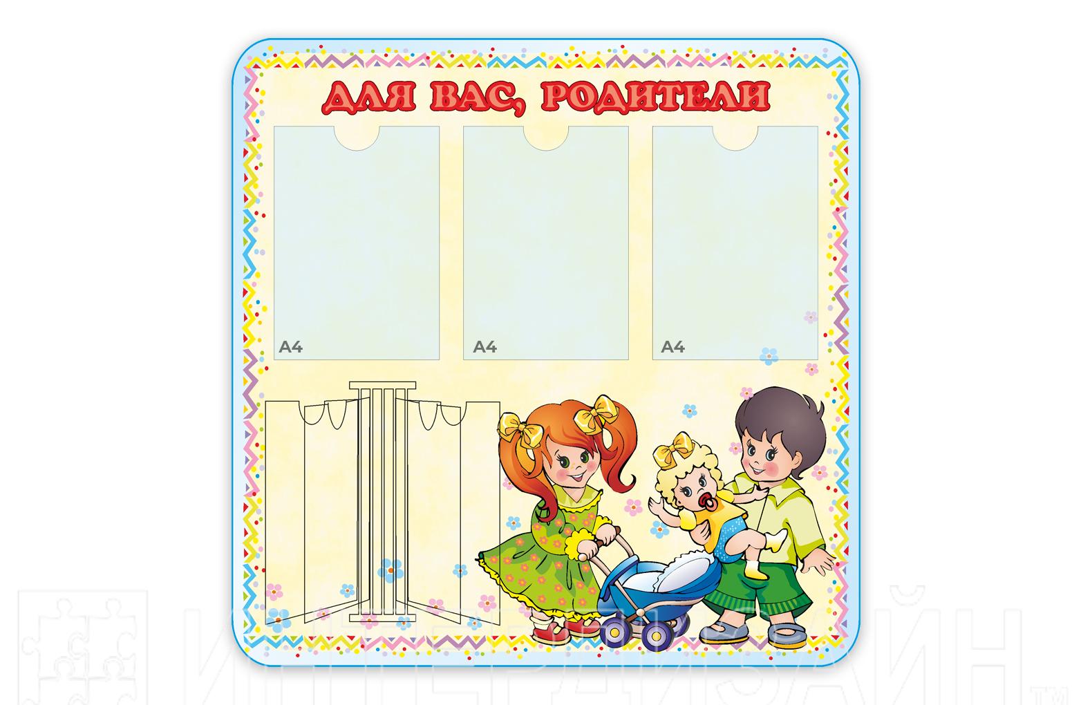 Стенд «Для вас, родители» выполнен из пластика толщиной 3 мм и содержит три кармана А4 и стенд-книжку на 5 файлов.