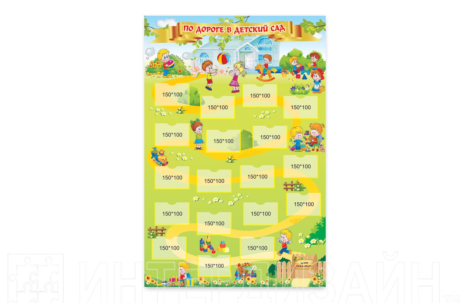 Стенд "По дороге в детский сад" (800х1200мм) с 18 карманчиками (150х100мм) для размещения фото и карточек.