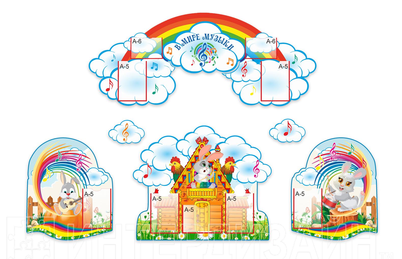 Размер:стенд-шапка 119х49 см, боковые стенды - 45х53 см, центральный стенд 75х60 см, тучки- 19х12 см