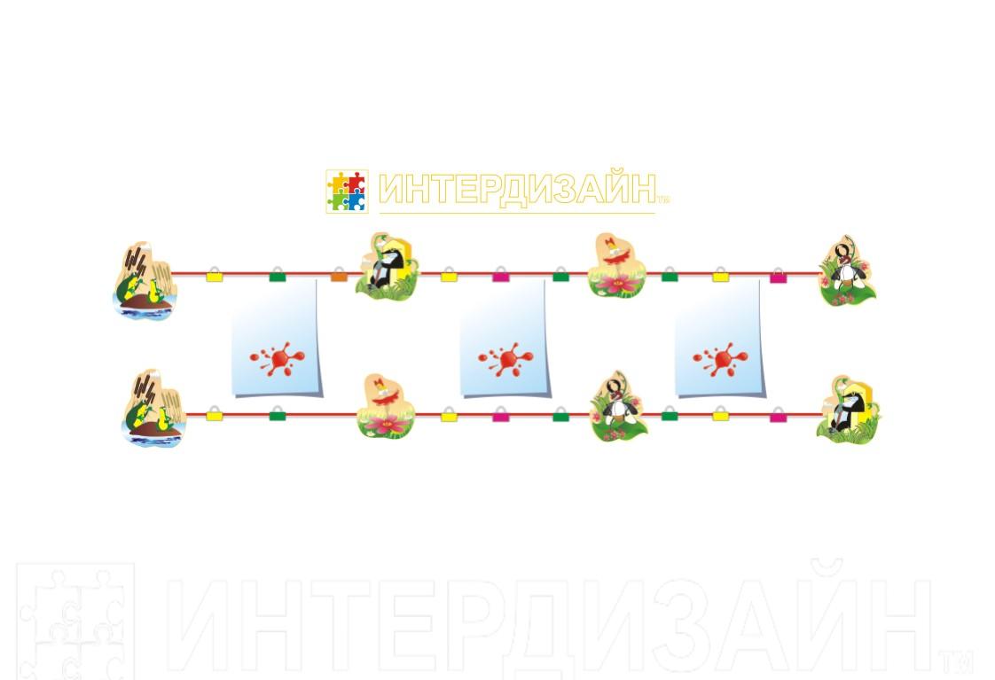 Схема размещения: к стене крепятся при помощи саморезов пластиковые элементы, на крепления к крючкам растягивается перлоновая нить (Вы сами выбираете необходимую Вам длину и степень натяжения), на нити нанизываются прищепки, к которым Вы крепите детские рисунки.