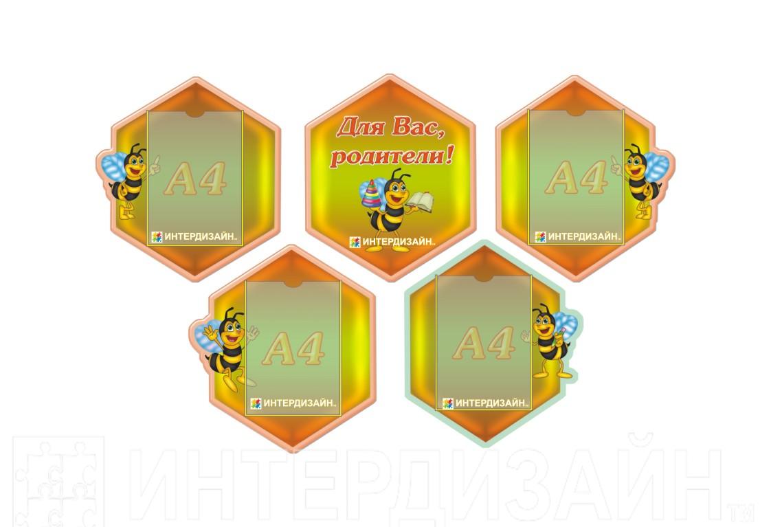 Композиция "Для родителей": стенд-центр (385х370мм), 4 кармана А4 (415х460мм, 420х470 мм, 400х465 мм, 405х465 мм). Материал - пластик.