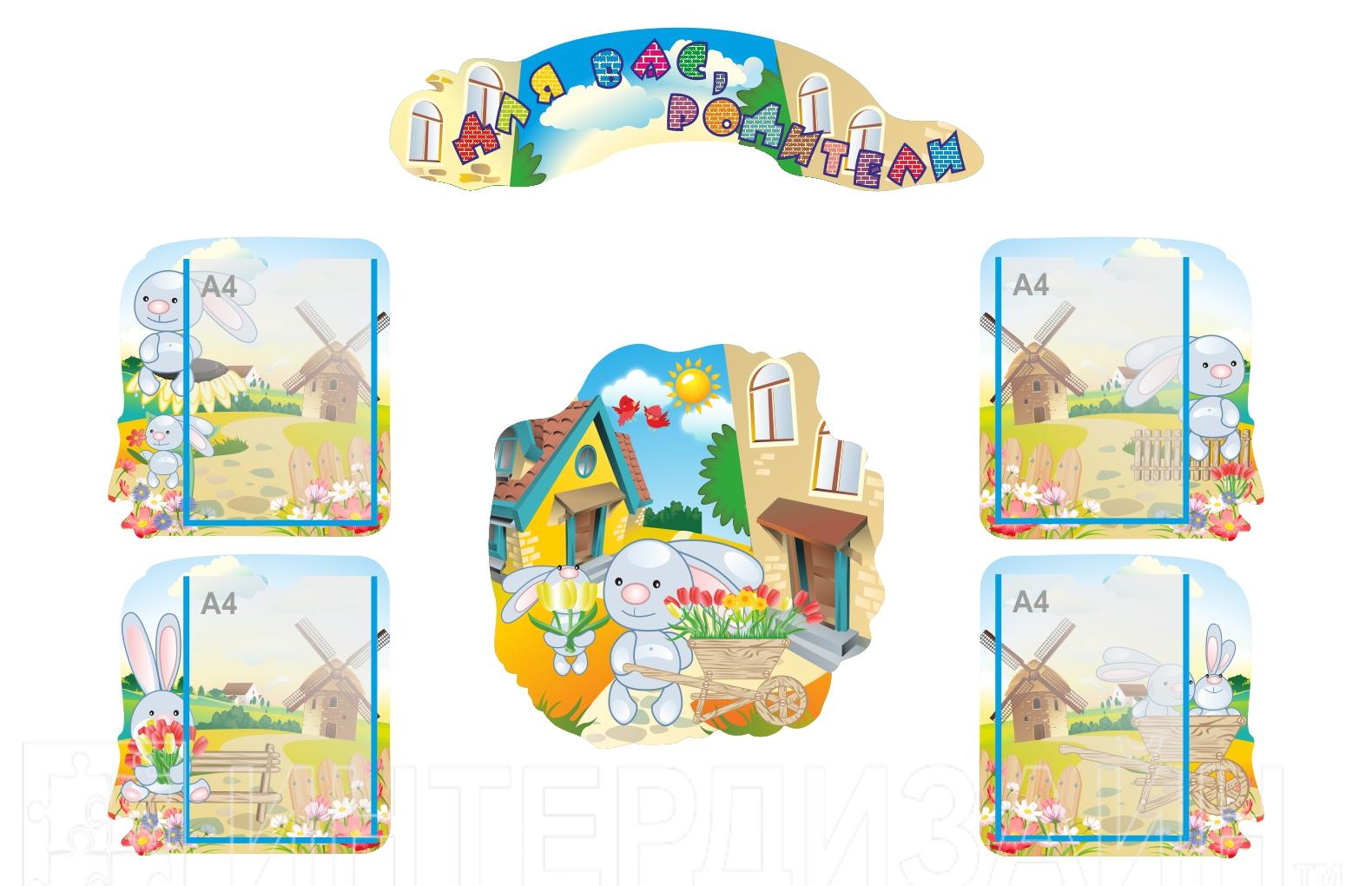 В комплекте:Стенд-шапка "Для Вас, родители", стенд "Зайка", стенды с карманами А4- 4шт, фурнитура для крепления.
