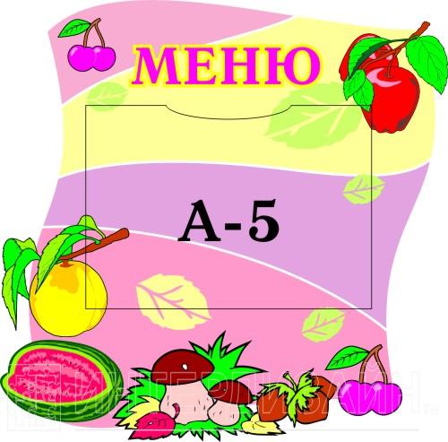 Стенд Меню для детского сада изготовлен из пластика ПВХ толщиной 3 мм. Изображение наносится на пленку методом полноцветной печати.