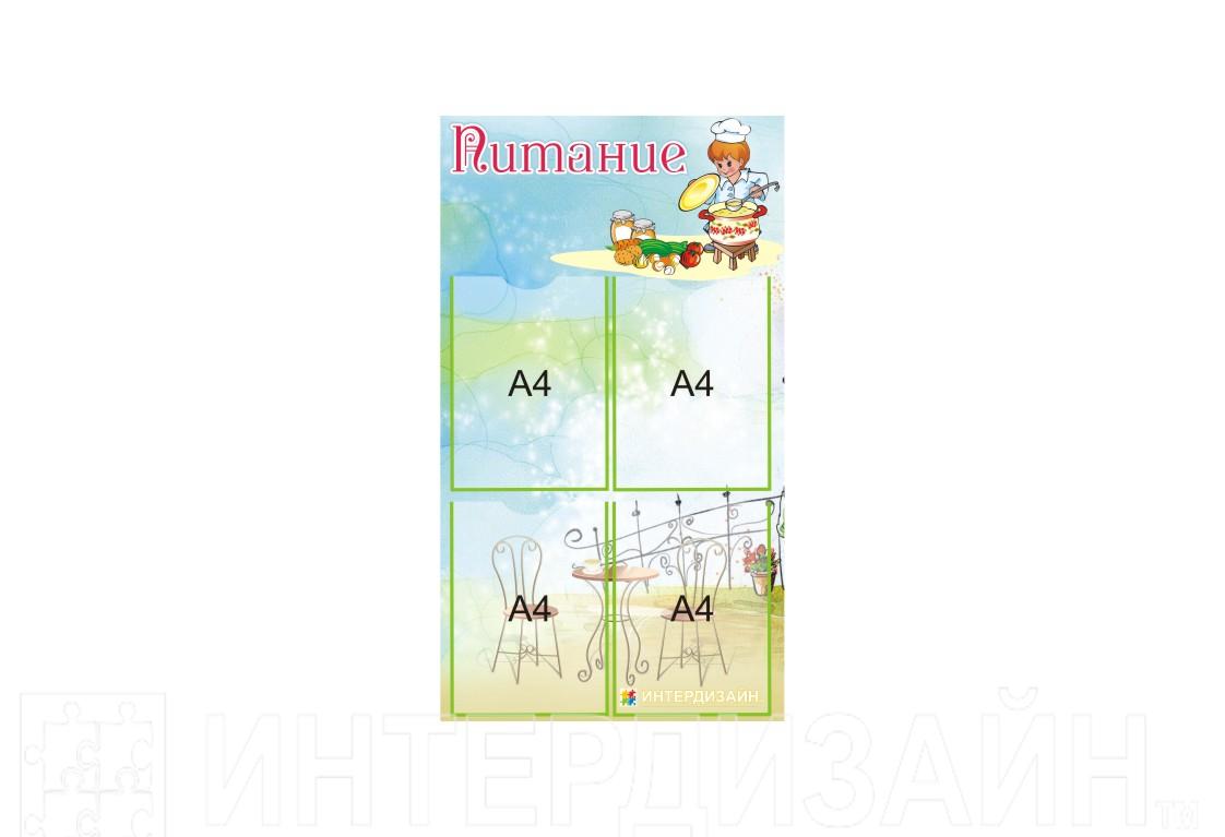 Оригинальный стенд "Питание" изготовлен из прочного пластика с 4 карманами А4 формата.