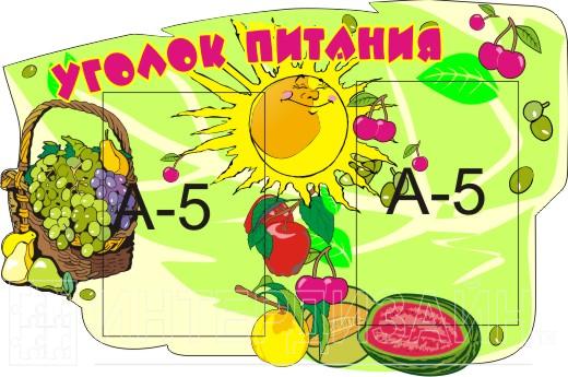 Стенд Меню "Уголок питания" изготовлен из пластика ПВХ толщиной 3 мм. Изображение наносится на пленку полноцветной печати.