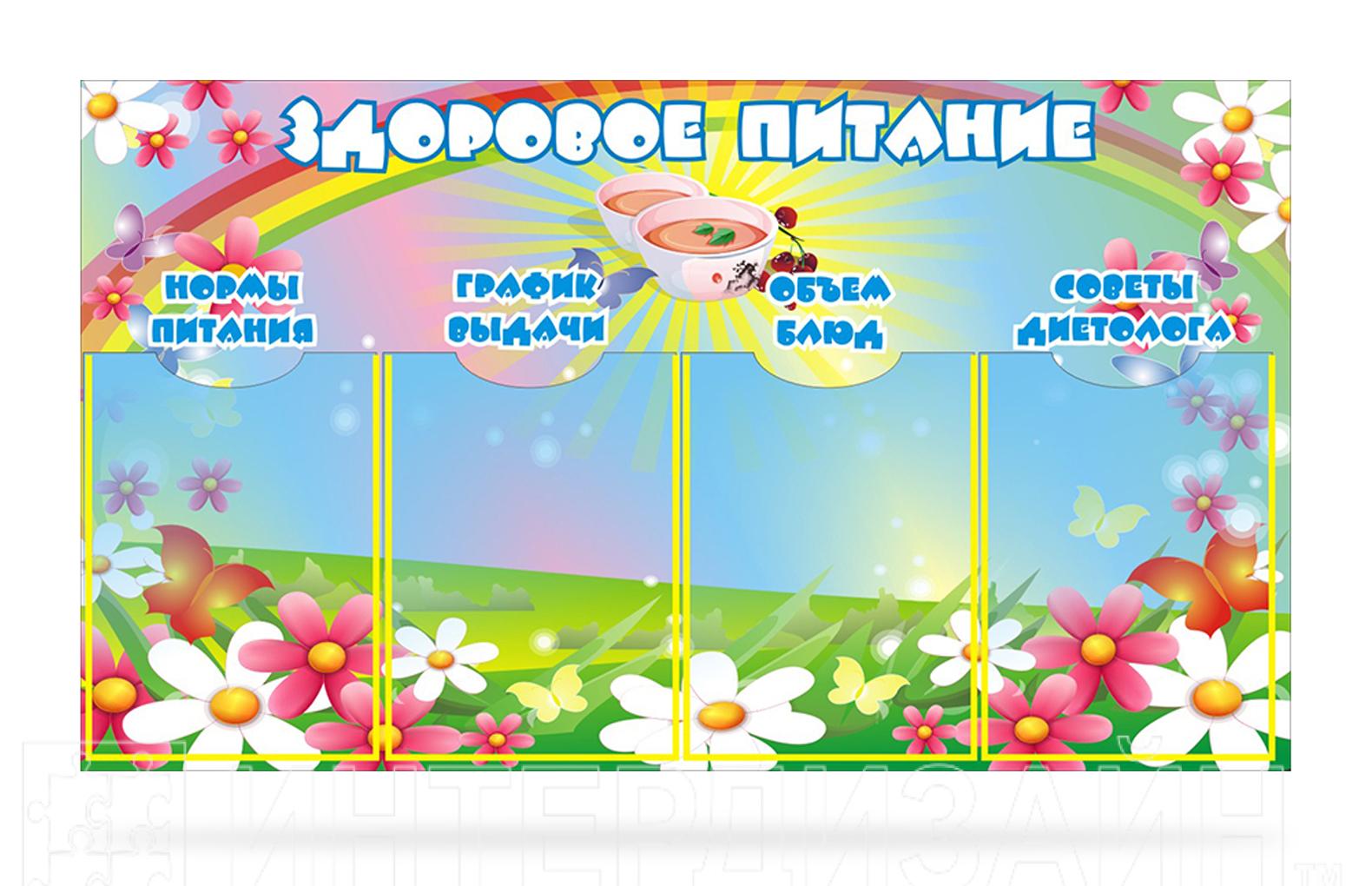Стенд из пластика, содержит 4 кармана А4: нормы питания, график выдачи, объем блюд, советы диетолога.