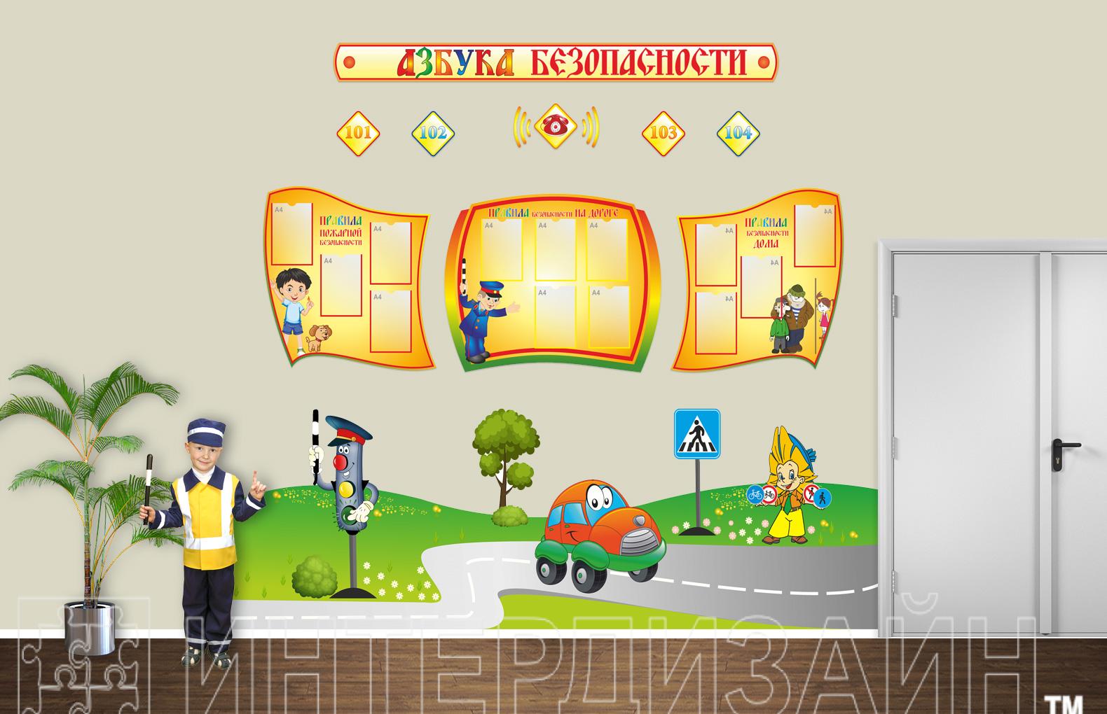 Размер:общий 350х302 см, стенд азбука безопасности 240х19.5 см, стенд правила пожарной безопасности- 93х91 см, стенд правила безопасности на дороге-111х89 см, стенд правила безопасности дома- 93х91 см, номера экстренных служб- 23х22 см, звук - 9х20 см, наклейка на дороге- 350х110 см