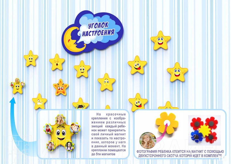 Каждый ребенок крепит свой личный магнит на крепление "Звездочка" с изображением определенной эмоции и таким образом показывает, какое настроение у него в этот день.