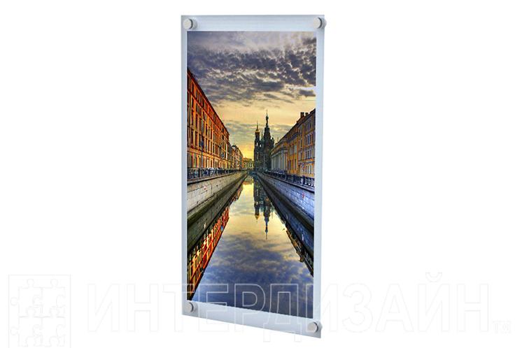 Изображения, отпечатанные на бумаге, между двумя прозрачными поверхностями, которые крепятся металлическими дистанционными держателями к стене.