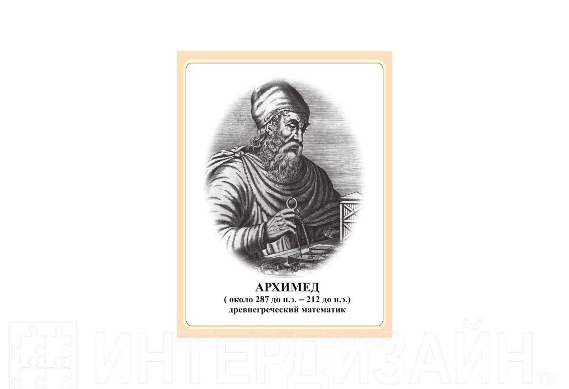 Архиме́д (Ἀρχιμήδης; 287 до н. э. — 212 до н. э.) — древнегреческий математик, физик и инженер из Сиракуз. Сделал множество открытий в геометрии. Заложил основы механики, гидростатики, автор ряда важных изобретений. Стенд портрет входит в полный комплект стендов для оформления школьного кабинета по математике. Можно приобрести отдельно от всего комплекта.