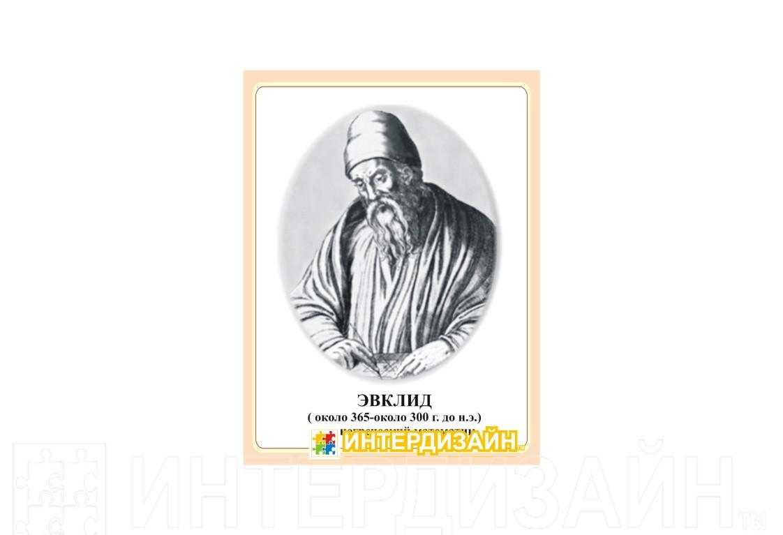 Евкли́д или Эвкли́д (др.-греч. Εὐκλείδης, от «добрая слава», ок. 300 г. до н. э.) — древнегреческий математик, автор первого из дошедших до нас теоретических трактатов по математике. Биографические сведения об Евклиде крайне скудны. Достоверным можно считать лишь то, что его научная деятельность протекала в Александрии в 3 в. до н. э. Стенд портрет входит в полный комплект стендов для оформления кабинета математики, можно приобрести отдельно от полного комплекта.