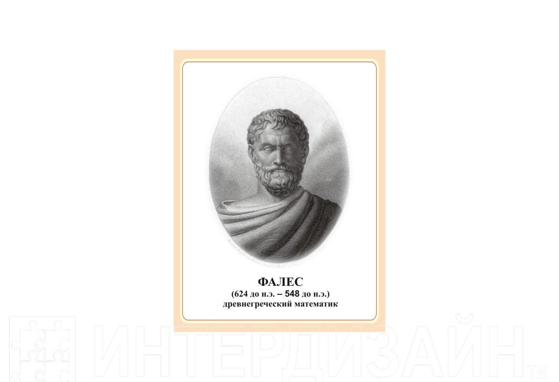 Фале́с (др.-греч. Θαλῆς ὁ Μιλήσιος, 640/624 — 548/545 до н. э.) — древнегреческий философ и математик из Милета (Малая Азия). Представитель ионической натурфилософии и основатель милетской (ионийской) школы, с которой начинается история европейской науки. Традиционно считается основоположником греческой философии (и науки) — он неизменно открывал список «семи мудрецов», заложивших основы греческой культуры и государственности. Стенд портрет входит в полный комплект оформления кабинета математики, может приобретаться отдельно от комплекта.