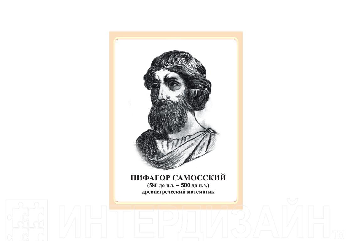 Пифагор Самосский (др.-греч. Πυθαγόρας ὁ Σάμιος, лат. Pythagoras; 570—490 гг. до н. э.) — древнегреческий философ, математик и мистик, создатель религиозно-философской школы пифагорейцев. Стенд потрет входит в полный комплект для оформления школьного кабинета по математике, можно приобрести отдельно от полного комплекта.