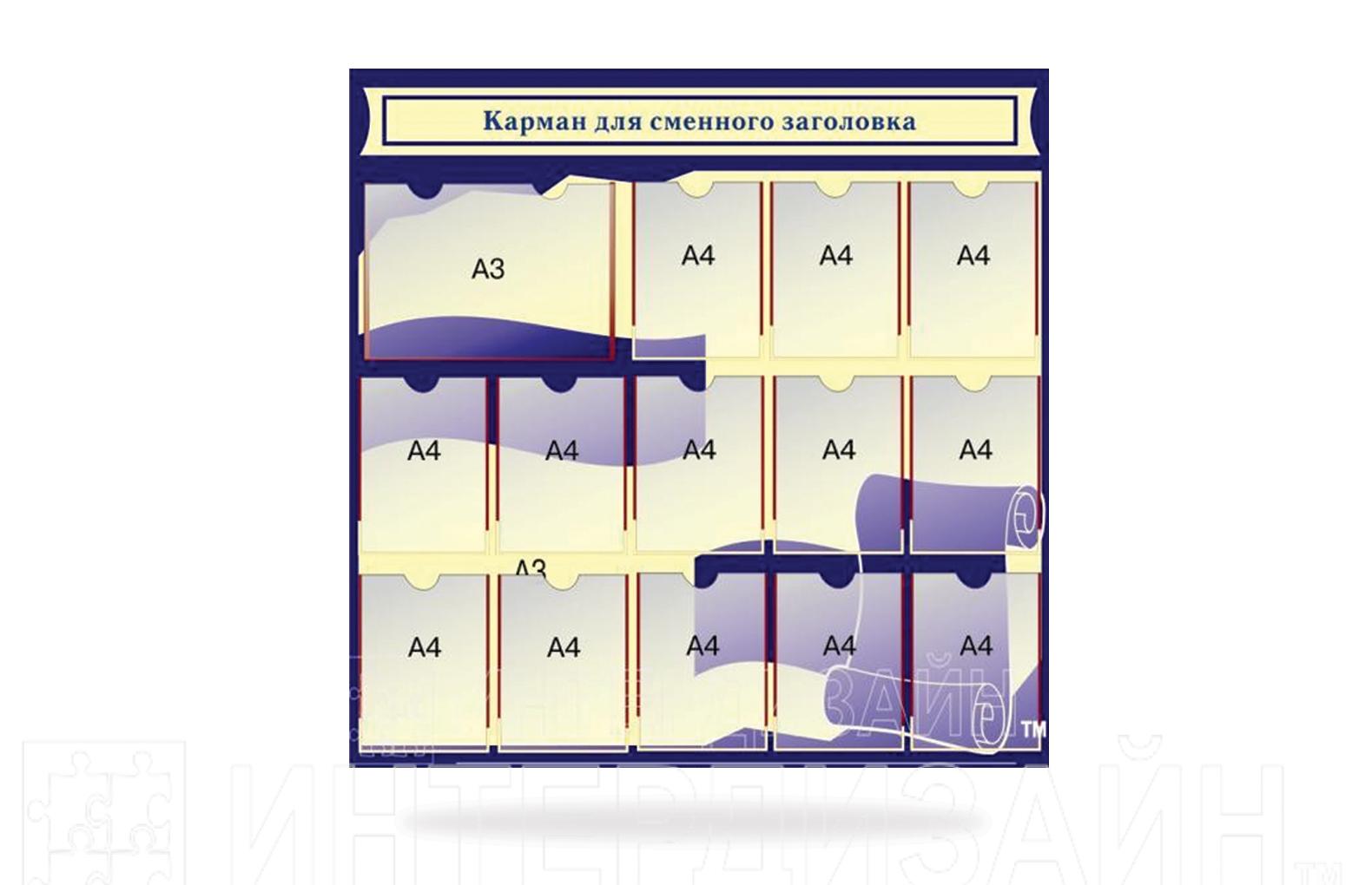 Стенд из пластика толщиной 3 мм. Размеры - 1200х1200 мм. Содержит 13 карманов А4 и 1 карман А3. Удобной особенностью стенда является наличие кармана для заголовка.