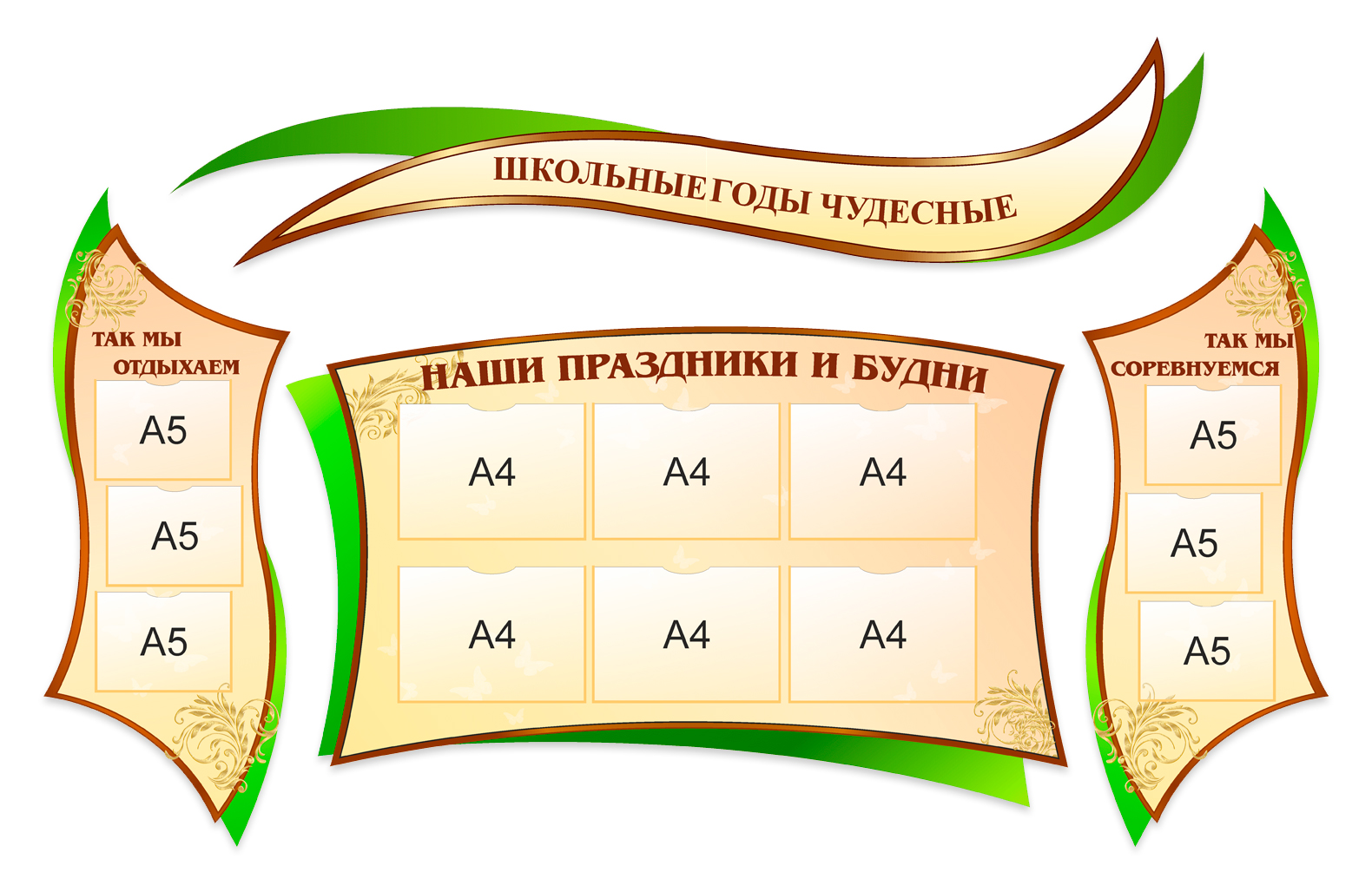 Размеры:стенд-шапка из 2-х частей 180х40 см, 2 стенда 41х110 см, центр стенд 130х80 см