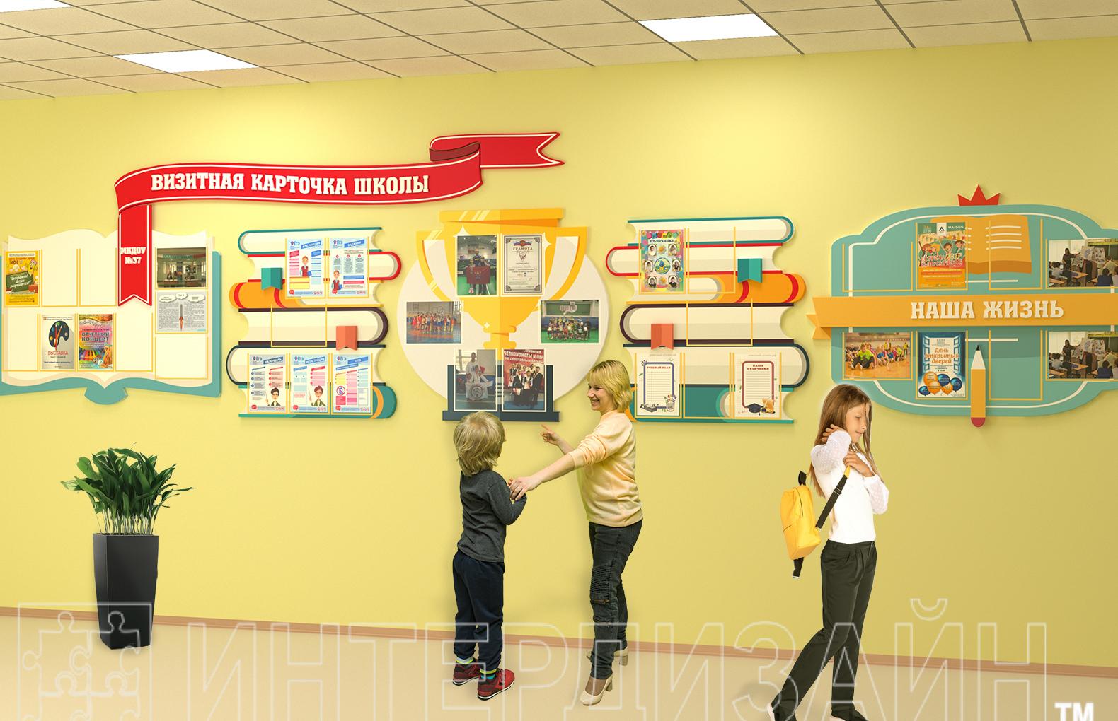 Обратите внимание на невероятно эффектный дизайн с элементами в форме книг и кубков. Он создает правильную позитивную и мотивирующую атмосферу в учебном учреждении.