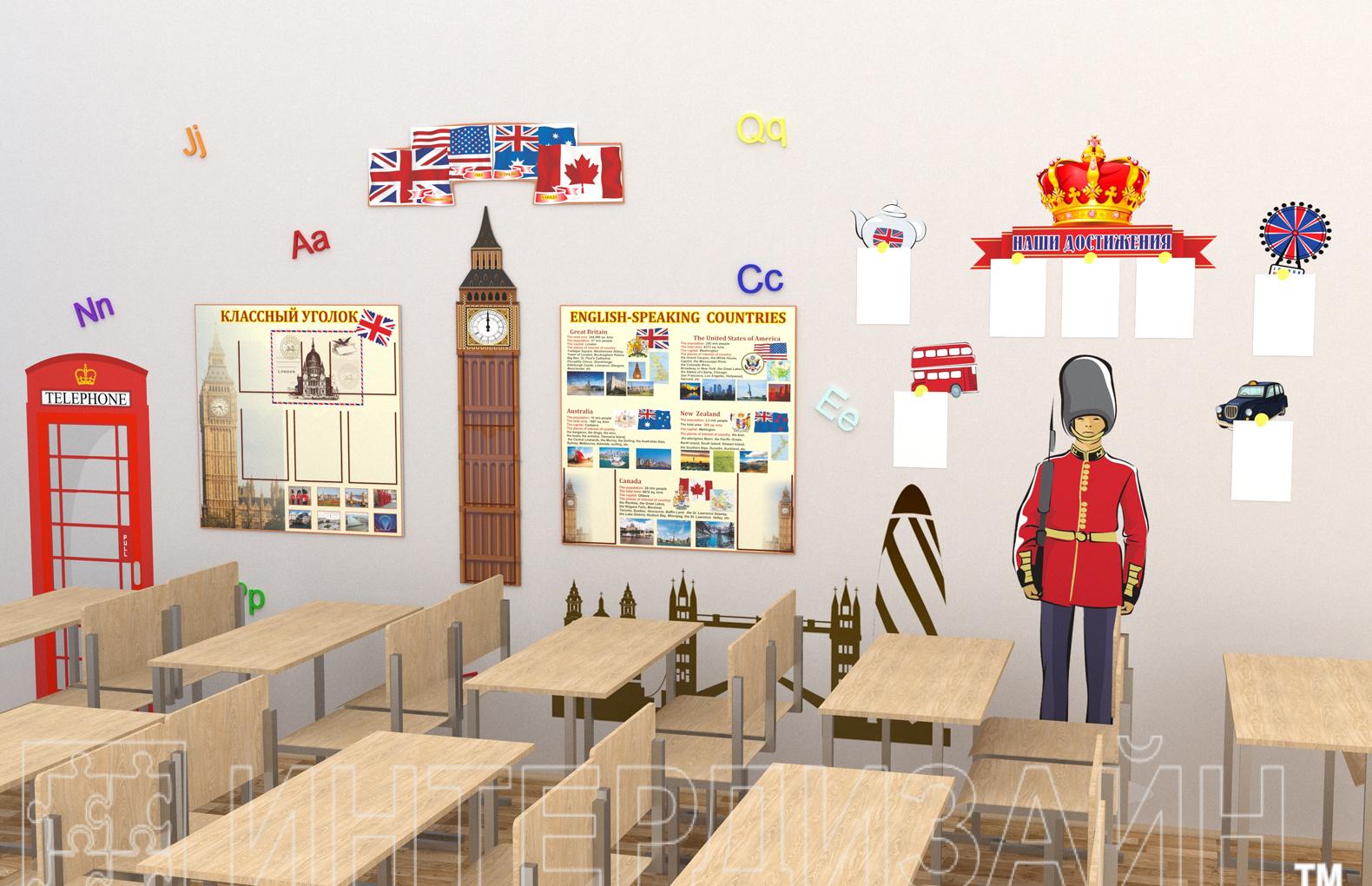 По рекомендации психологов в интерьерное решение для кабинета английского языка включены информационные и декоративные элементы, которые особым образом влияют на вовлеченность учеников в процесс обучения.
