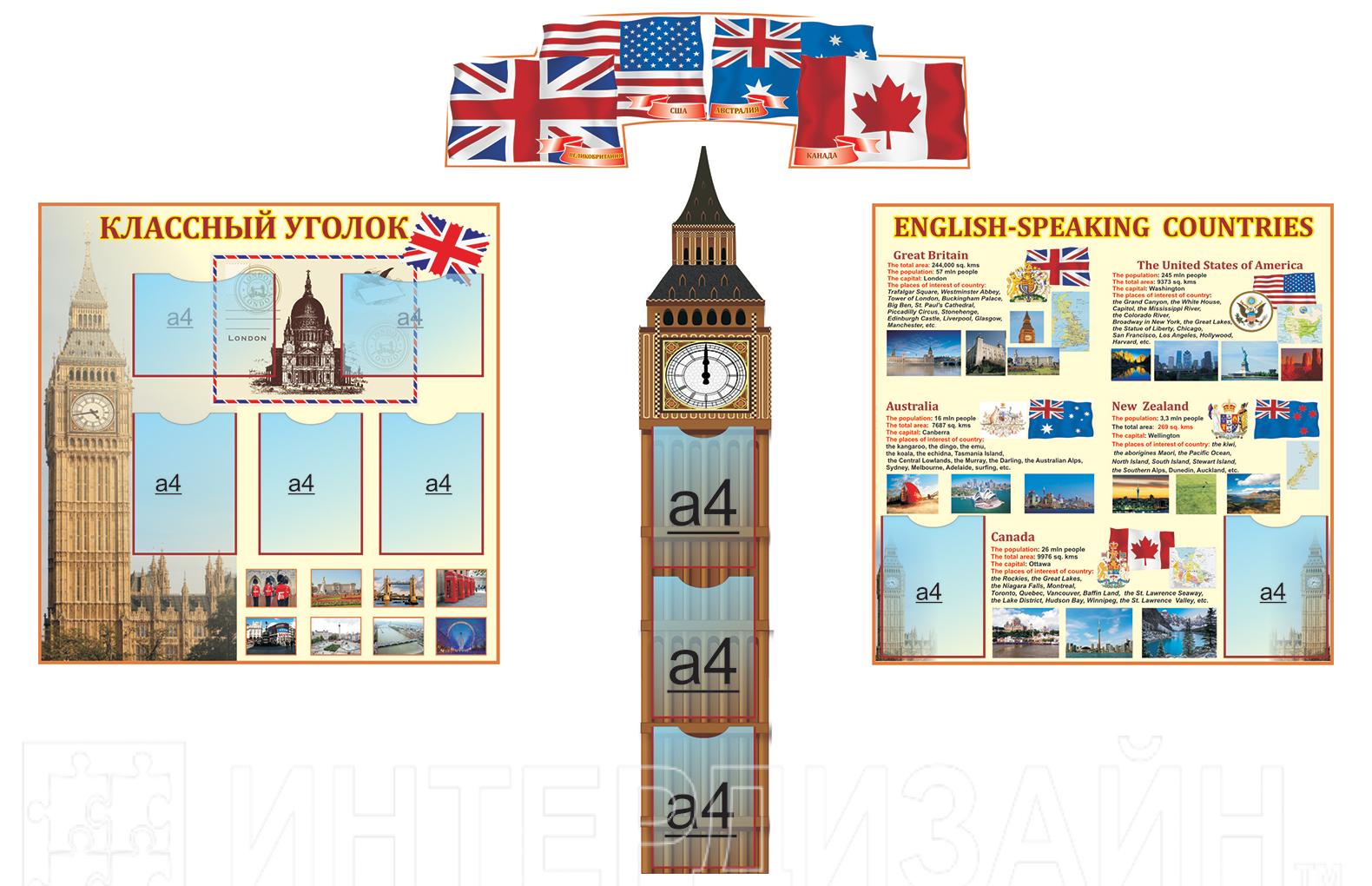 стендов "Классный уголок" (1000х1000мм, 5 карманов А4) и "Englisn-speaking countries" (1000х1000мм, 2 кармана А4);