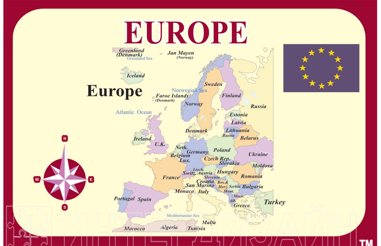 Стенд для школьного кабинета английского языка, показывает наглядно карту Европы с названием стран на английском языке. Из комплекта для оформления кабинета английского языка.
