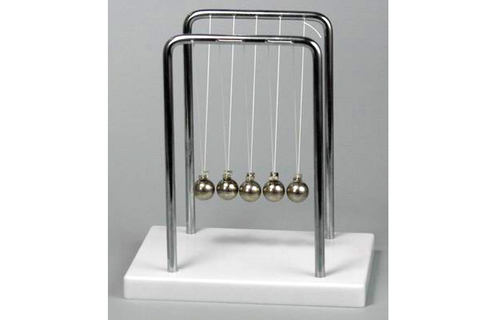 Сначала из состояния равновесия отводят на небольшой угол первый шар и отпускают. После удара шар останавливается, а пятый шар отклоняется примерно на такой же угол. Демонстрацию повторяют, отклоняя два шара. При этом из состояния равновесия отклонятся четвертый и пятый шары, а третий останется неподвижным. Кнопки фиксируют нити подвеса и служат для настройки прибора - их поочередно извлекают, подтягивают нить так, чтобы все шары выстроились строго по одному уровню, затем нить вновь фиксируют иглой кнопки.