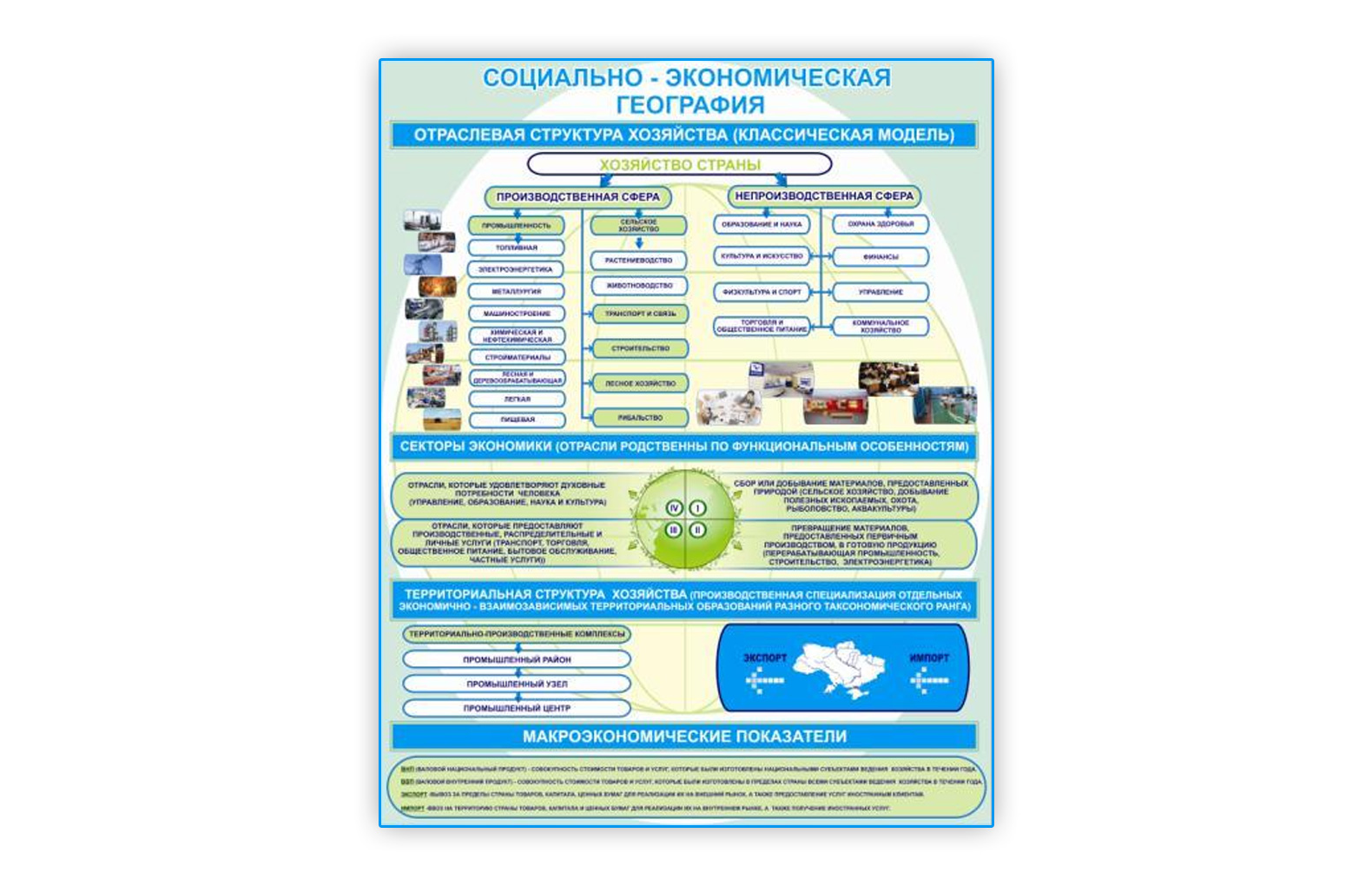 Стенд Социально-экономическая география 2 плакат из серии. Входит в полный комплект оформления школьного кабинета Географии стендами. Можно приобрести отдельно от всего комплекта.
