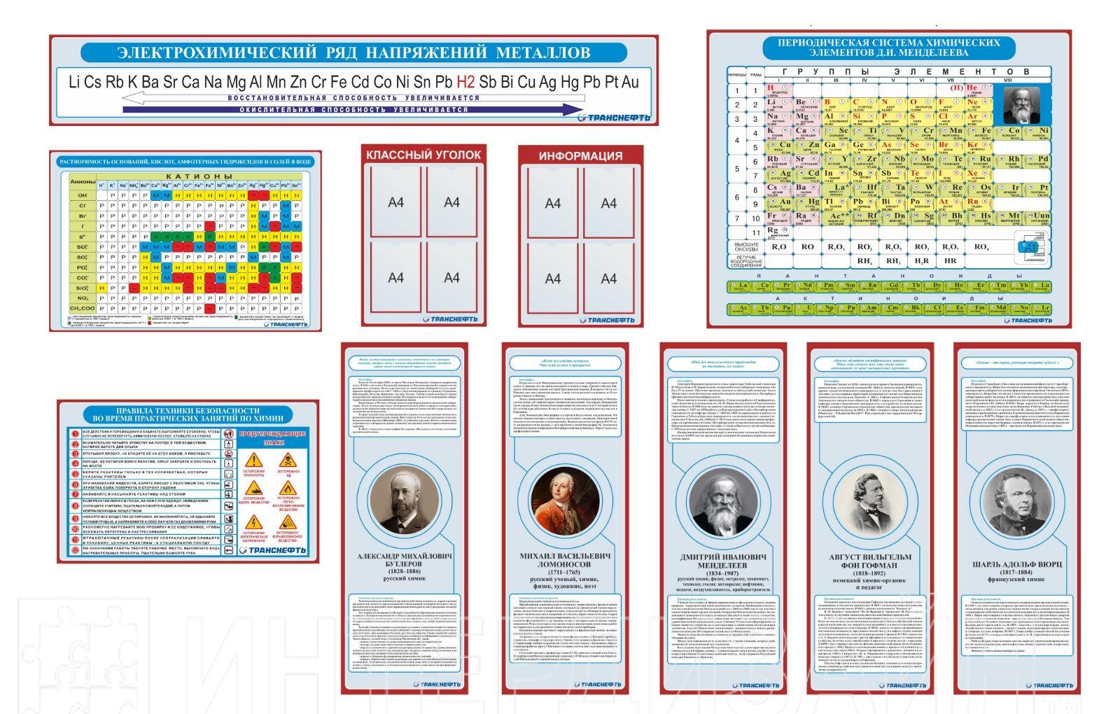 В комплекте5 стендов с учеными, стенд Таблица Менделеева, стенд Катионы, стенд правила безопасности на уроке химии, классный уголок, стенд информация, фурнитура для крепления