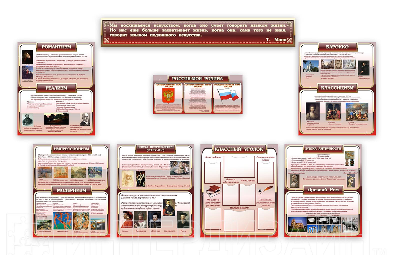 Стенды композиции изготовлены из пластика ПВХ толщиной 3 мм. Изображение наносится на пленку. Дополнительно стенды оснащены карманами для сменной информации стандартных форматов.