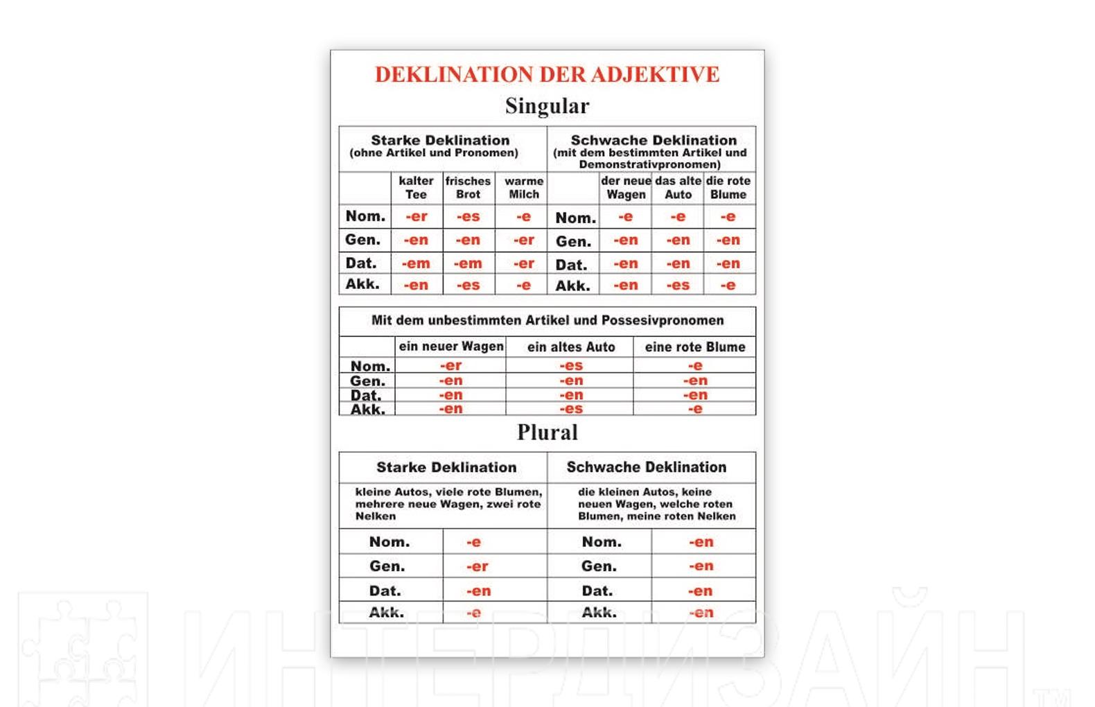 Стенд "Deklination der Adjective" изготовлен из прочного пластика. Изображение – УФ печать (гарантированно не выгорает, не выцветает на протяжении 5 лет)