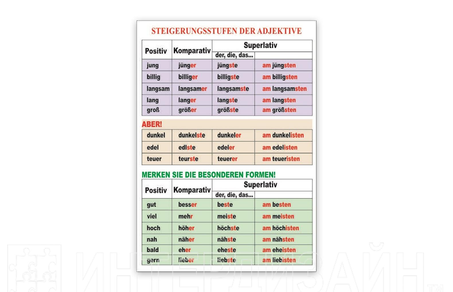 Стенд "Steigerungsstufen der Adjektive" изготовлен из прочного пластика. Изображение – УФ печать (гарантированно не выгорает, не выцветает на протяжении 5 лет)