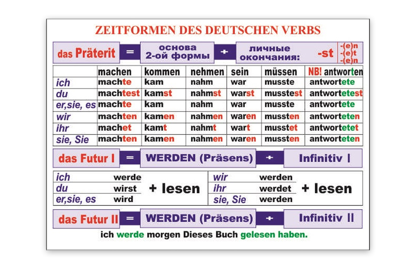 Стенд "Zeitformen des Deutschen verbs" изготовлен из прочного пластика. Изображение – УФ печать (гарантированно не выгорает, не выцветает на протяжении 5 лет)