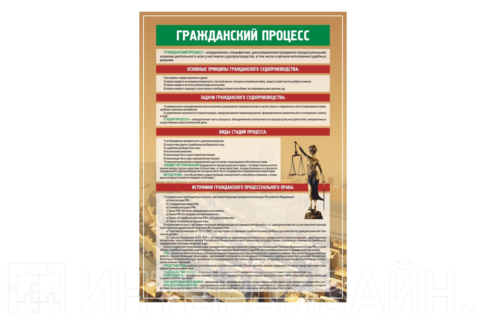 На стенде размещено определение понятия "Гражданский процесс", и основные знания этого правового раздела.