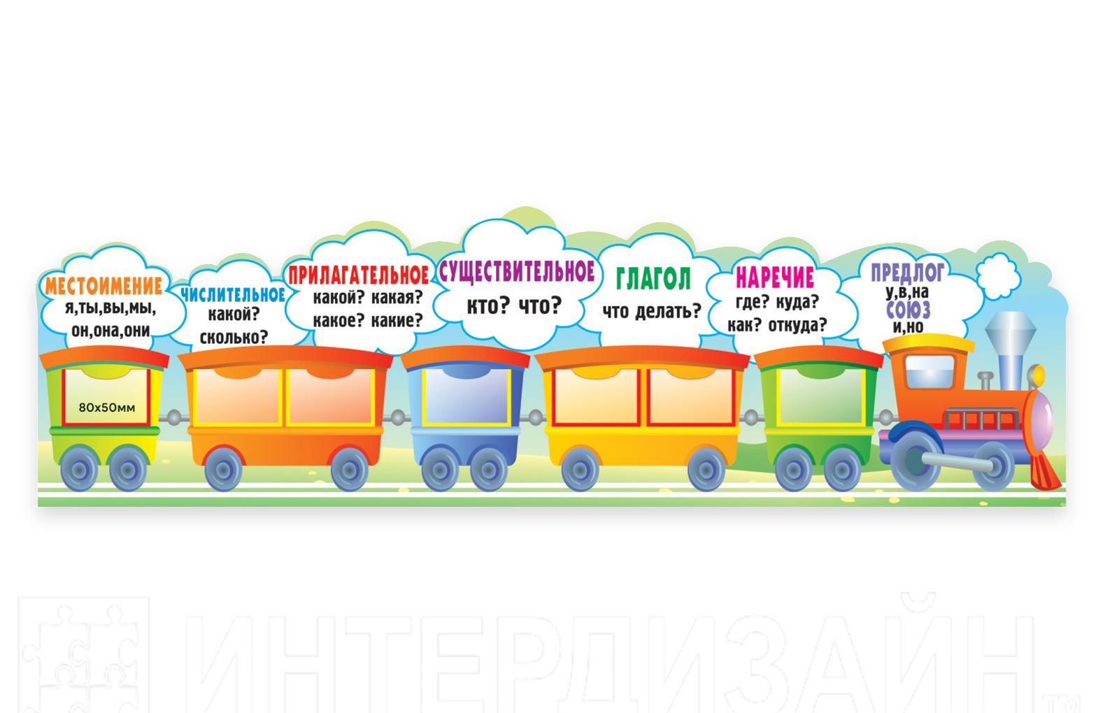 Стенд из пластика "Части речи" в виде паровозика. Изображение - яркая высококачественная печать с УФ-защитой.