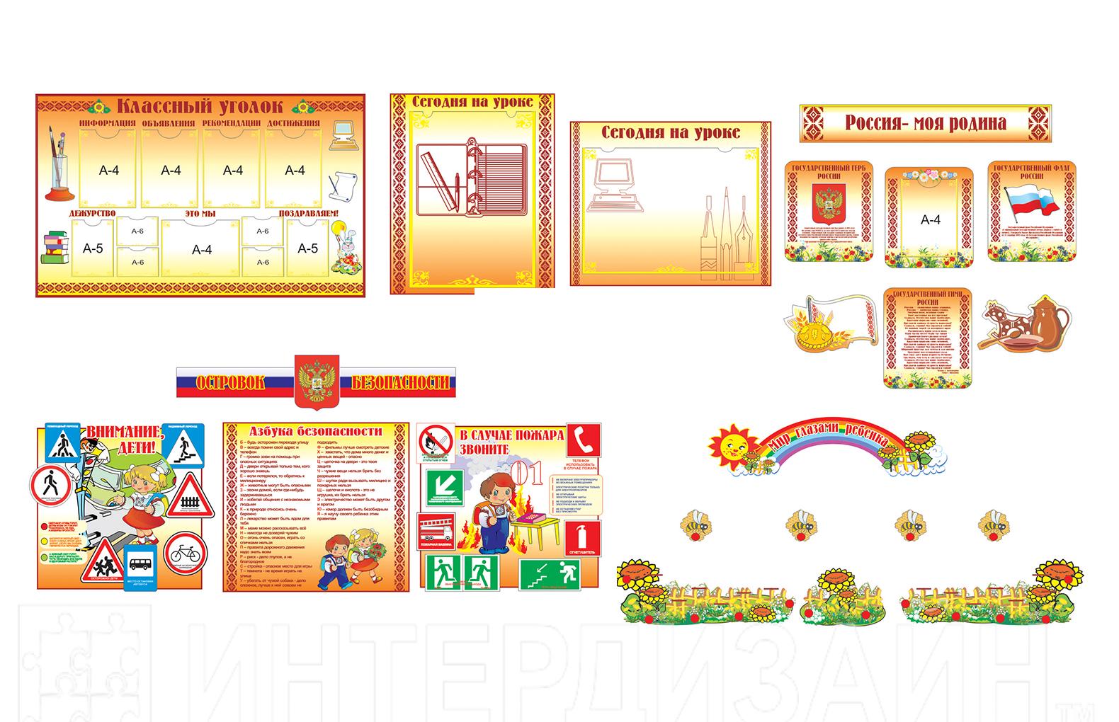 Размерклассный уголок - 130х80 см , 2 стенда "Сегодня на уроке" - 65х80 см, шапка "Россия - моя родина" 100х15 см, 4 мини стенда 35х40 см, 2 стенд-рисунка -37х23 см, мир глазами ребенка: шапка 100х25 см, крепления 13х13 см, подсолнухи - 77х27 см, 35х24 см, шапка "островок безопасности" - 83х17 см, 3 стенда безопасности - 55х50 см