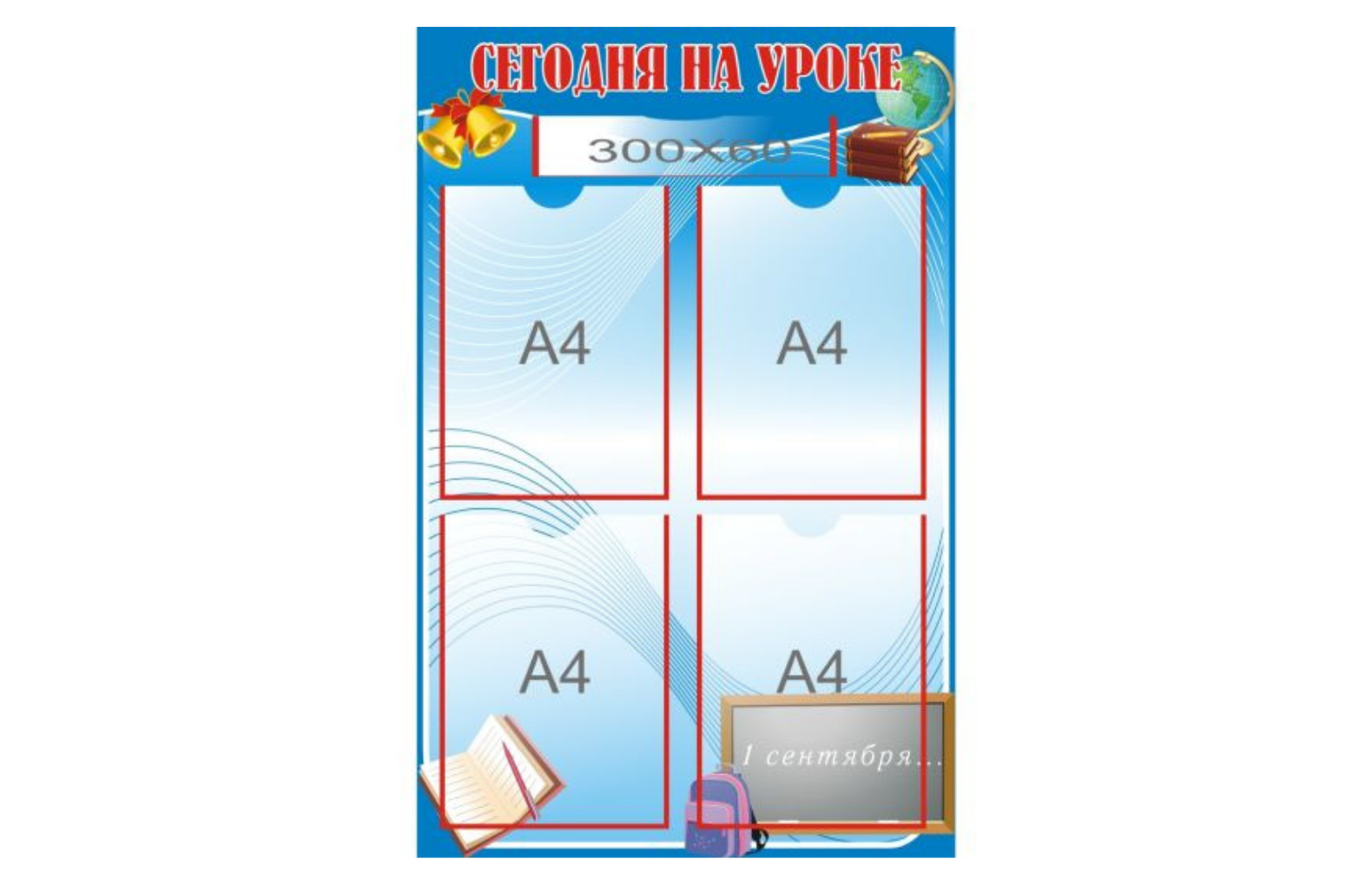 Стенд оборудован 4 карманами А4 формата и 1 карманом 300х60мм.