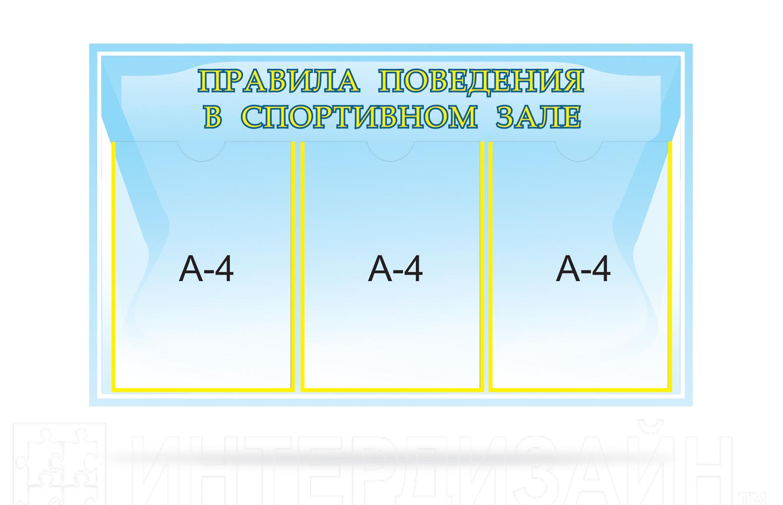 Стенд Правила поведения в спортивном зале для размещения информации в специальных карманах формата А4. Входит в полный комплект оформления кабинета физкультуры, спортивного зала. Можно приобрести отдельно от комплекта.