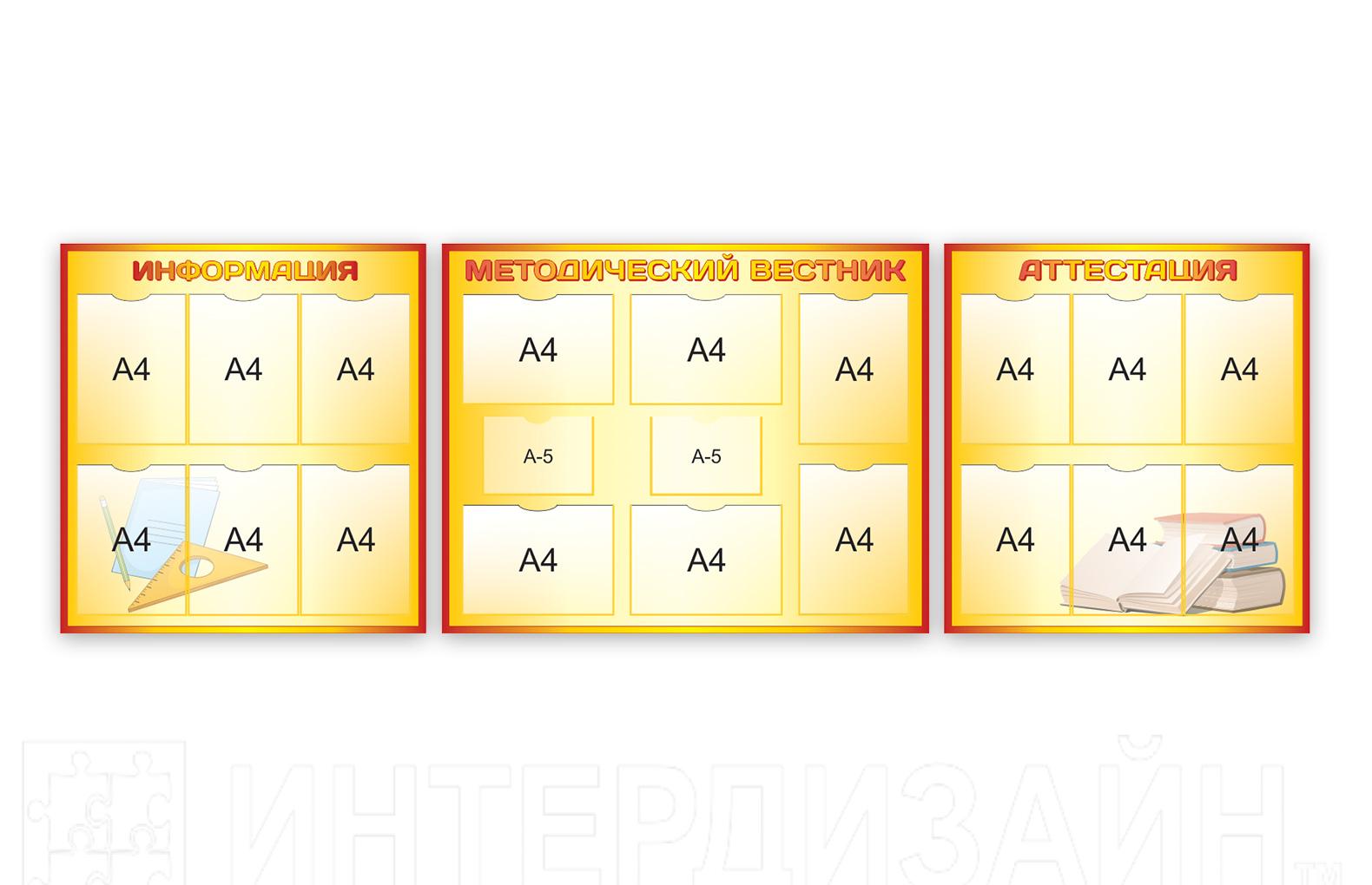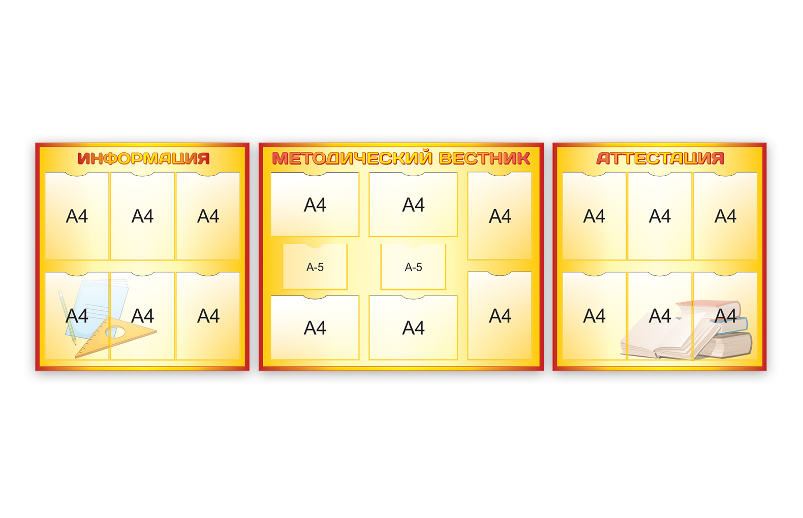 Размер:"Информация" - 750мм х 800мм, "Методический вестник" - 1000мм х 800мм, "Аттестация" - 750мм х 800мм