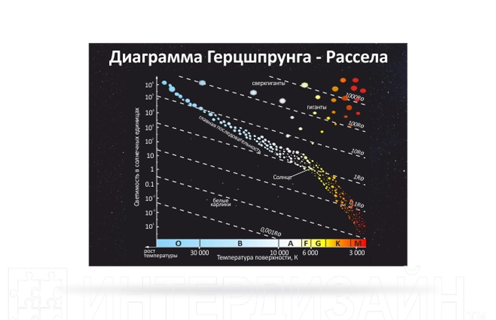 Стенд Диаграмма Герцшпрунга — Рассела для кабинета асторономии. На стенде диаграмма показывающая зависимость между абсолютной звёздной величиной, светимостью, спектральным классом и температурой поверхности звезды.