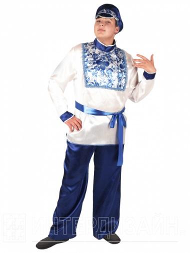 Русские народные ремесла славились во всем мире испокон веков. Одним из таких направлений народного творчества, прославившим Россию на мировом рынке дизайна, стала гжельская роспись. Искусные кобальтовые узоры на тонком белом фарфоре выгладят настоящим произведением искусства. Именно эти узоры вдохновили наших художниц на создание карнавального костюма Гжель, который выполнен по эскизам национальных русских костюмов конца 19 века. Рубашка-косоворотка украшена жаккардовой тесьмой, белая рубашка подпоясывается синей широкой лентой в цвет брюк. Картуз уплотнен и хорошо держит форму.