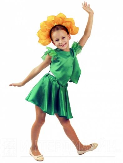 Детский карнавальный костюм Подсолнух состоит из расклешенной юбочки, жилетки и ободка с лепестками. Жилетка застегивается на липучку.