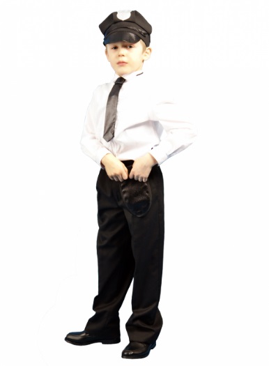 Карнавальный костюм Полицейский разработан специально для детей. Он отлично подходит для ролевых игр дома и для праздников в детским саду. Костюм Полицейского состоит из шапки, выполненной из габардина, кобуры и галстука на резинке. На шапку нанесена апликация из парчи в виде звезды. Костюм желательно дополнить белой рубашкой, черными брюками или джинсами, черными ботинками.