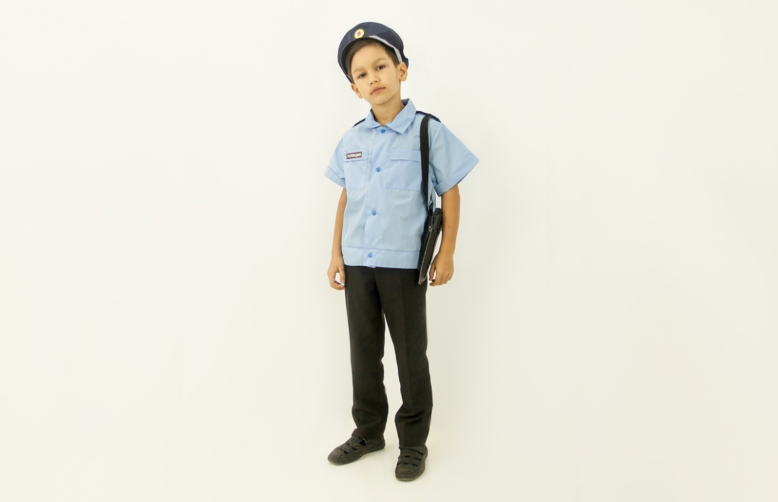 Карнавальный костюм Полицейский разработан специально для детей. Он отлично подходит для ролевых игр дома и для праздников в детским саду. Костюм Полицейского состоит из шапки, выполненной из габардина, кобуры и галстука на резинке. На шапку нанесена апликация из парчи в виде звезды. Костюм желательно дополнить белой рубашкой, черными брюками или джинсами, черными ботинками.