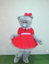 МатериалОбъемная голова сделана из поролона, обшитая плюшем серого цвета, смотровая область в глазах, на подкладке. Накладной живот для объема выполнен из поролона, обшит хлопковой тканью. Комбинезон из плюша серого цвета, на подкладке. Платье выполнено из габардина красного цвета в белый горох, с подъюбником из белого фатина.. Пара варежек из плюша серого цвета. Пара обуви- поролоновый каркас, обшитый плюшем серого цвета, на полиуретановой подошве.