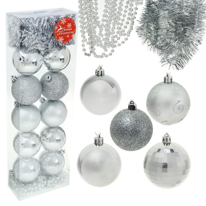 Ёлочные украшения Серебро с бусами и мишурой (набор 12 шт.) - Описание