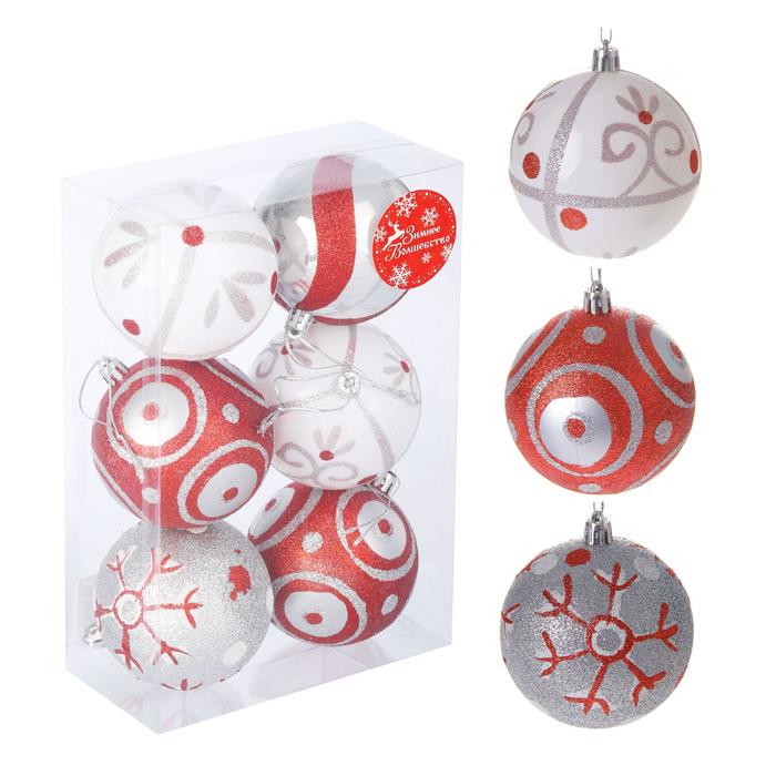 Набор шаров пластик d-8 см (набор 6 шт) рисунки бело красный - Описание