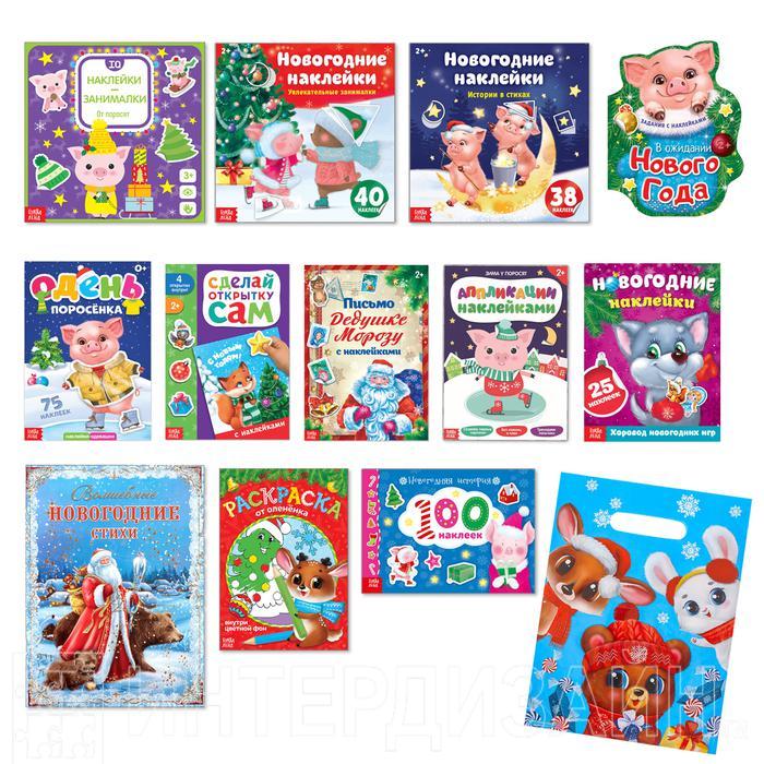 Набор новогодних книг — прекрасный подарок для каждого ребёнка. В нём есть книги с заданиями, стихами, раскраска и книжки с яркими наклейками, которые так любят дети!